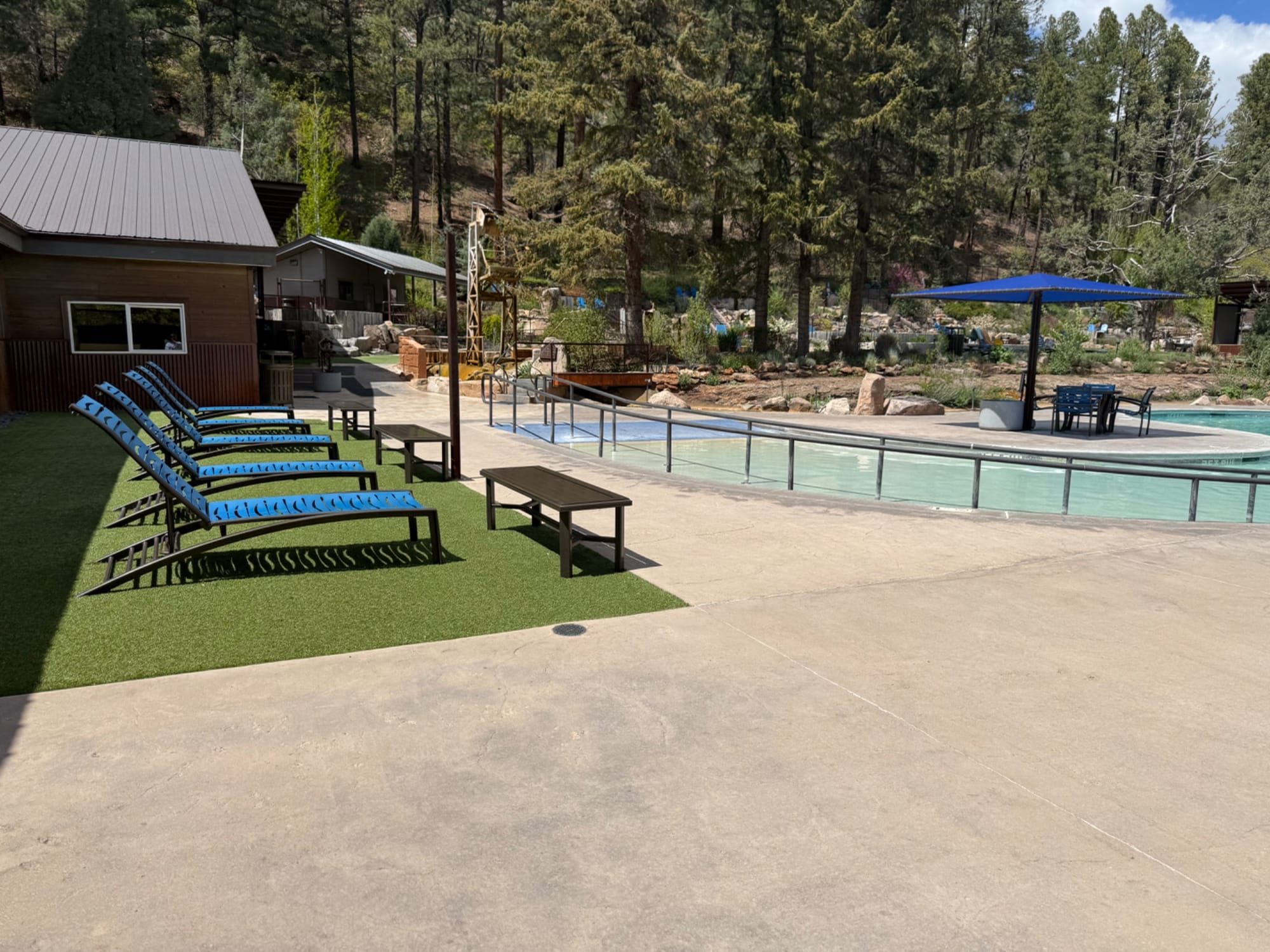 Durango Hot Springs sits about 6 miles north of downtown along County Road 203, set into the valley above the Animas River. Multiple pools at different temperatures are spread across an outdoor complex, and the main pool uses a zero-entry design. You can roll or walk directly into the water without navigating steps or a lift. The surrounding terrain has some moderate slopes in parts (rated 3 out of 5 in the main outdoor areas), and the paths are accessible throughout.
