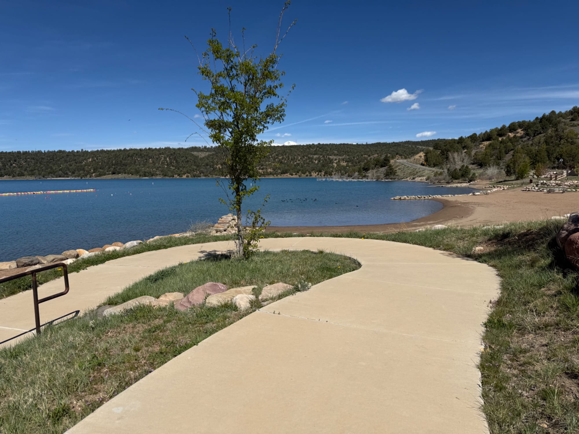 Lake Nighthorse is a reservoir about 3 miles southwest of downtown, open for swimming, paddling, and fishing from late spring through summer. The Bureau of Reclamation manages it, and the access is drive-in, so you just pay at the ticket booth and then park close to the water. There's a dedicated ADA fishing area reached by a gentle ramp with handrails, with accessible paths down to the shoreline. If you want to rent kayaks or rafts, you can do that at 4Corners Riversports. They have a location at Lake Nighthorse.