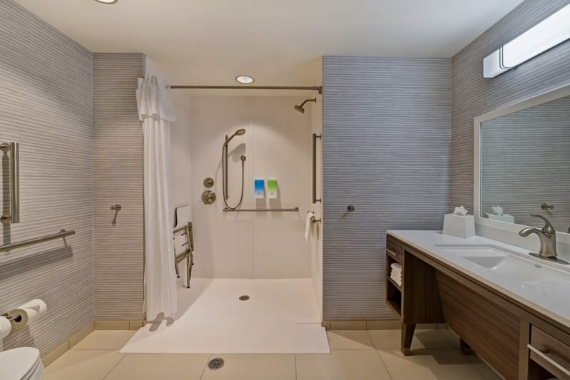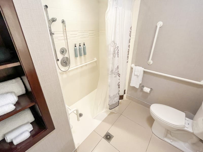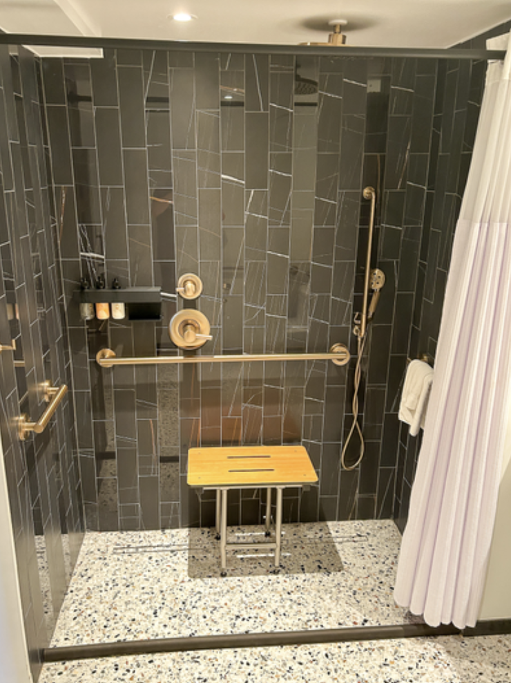 Rooms have similar features, although there are special hearing-accessible rooms with additional features including a door signaler, and visual notifications for smoke and fire alarms. Elsewhere, rooms are similar offering step-free access, 60 in turning space, 25 in bed height (28 in for Kings), grab bars, and a bathtub with a fixed shower seat. The Double Queen is the only option with a roll-in shower.