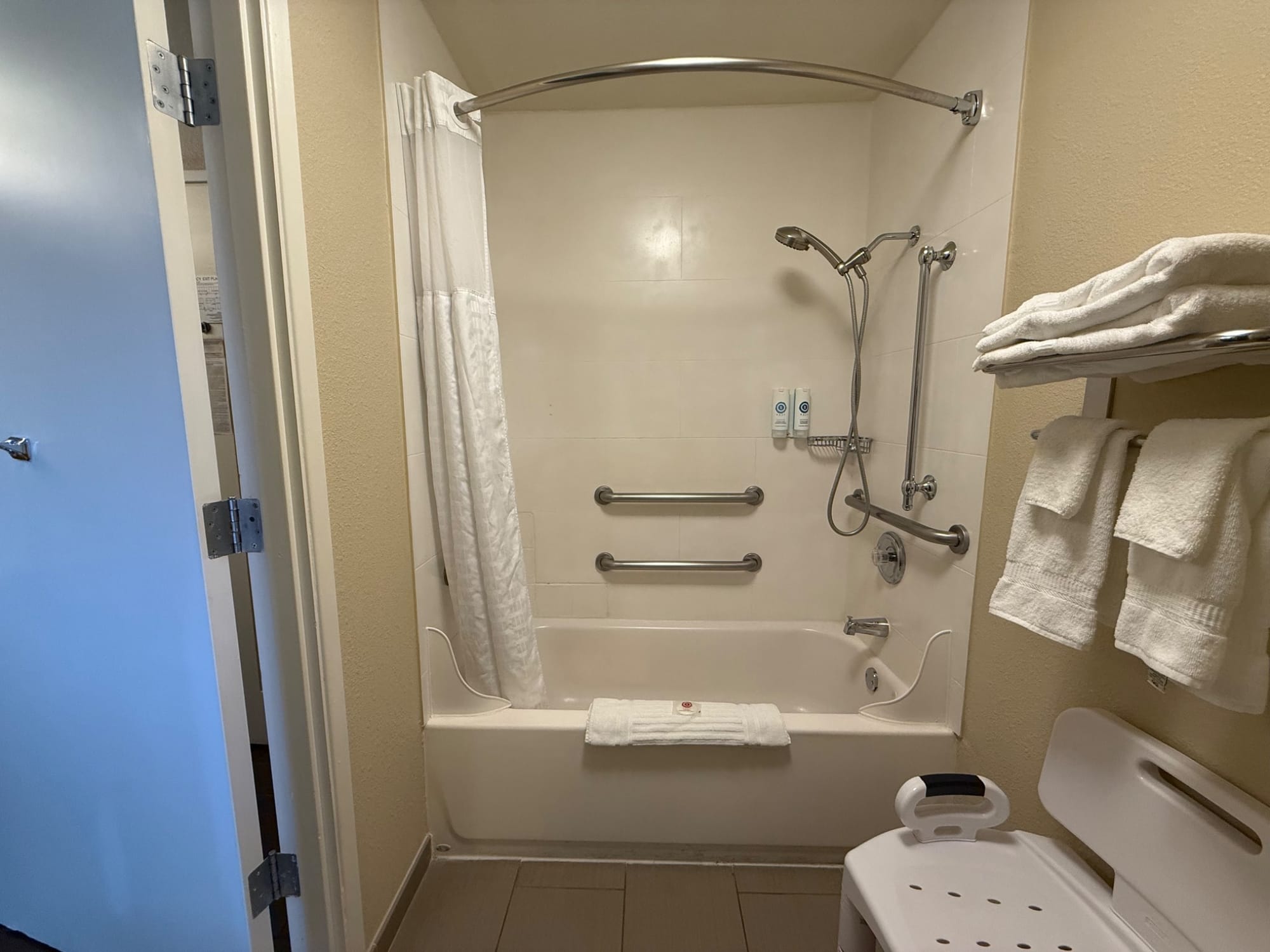 Their accessible rooms feature a low-entry bathtub with a seat, handheld showerhead, and grab bars. The entrance and common areas are step-free, and there’s good turning space in the bathrooms.