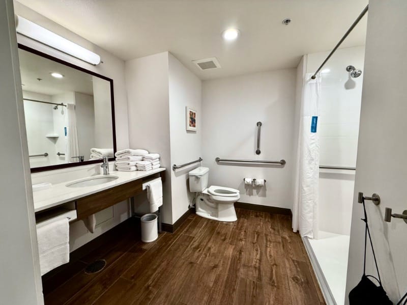 Their accessible rooms include walk-in showers with seats, wide doorways, and generous turning space—plus a bit more clearance under the bed for those who need a Hoyer lift.