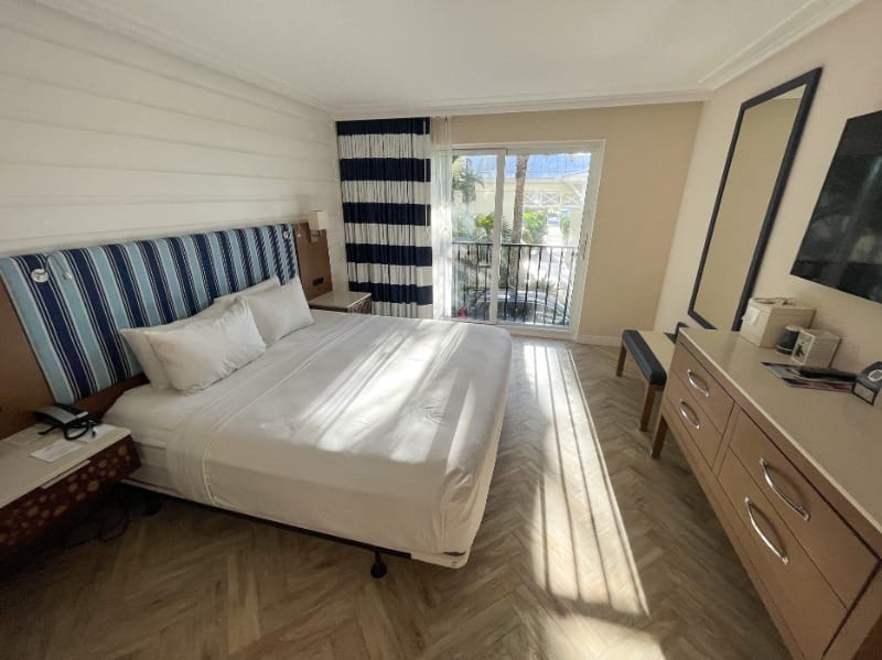 The hotel as a whole is easy to access, as are the various restaurants and facilities within the complex. Going swimming is made easy as there is ground-level entry and a pool lift into the swimming pool itself. The accessible rooms offer a roll-in shower. However, there is less than 60 in of turning space within the bathroom itself, though the main bedroom area has over 60 in. Several visual guidance aids are provided in the room, including a door signaler.