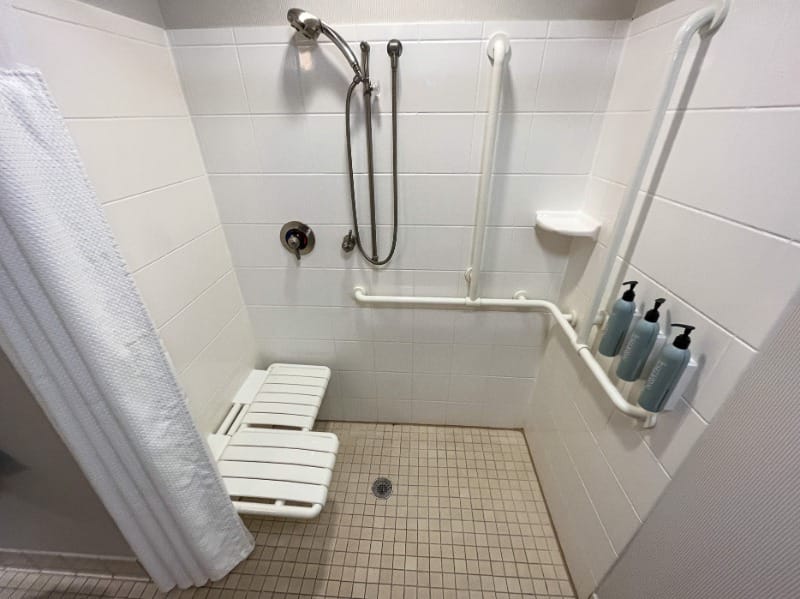 Rooms here have several excellent accessibility features in place. There's a roll-in shower with a flat entrance, grab bars, a portable shower seat, and plenty of turning space in the bathroom. The bedroom is also spacious and has a king-sized bed at 22 in with more than 40 in of free space on each side.