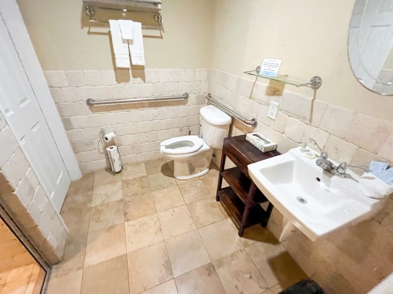 The Palmer Suite ADA room is the only accessible option here. It's got a number of strong accessibility measures in place such as a roll-in shower with a flat entrance. While the bedroom has more than 60 in of turning spaces available, the bathroom does not. However, there is an accessible balcony with a ramp, and deck flooring and it's clear of obstacles for great views of the surrounding area and town.