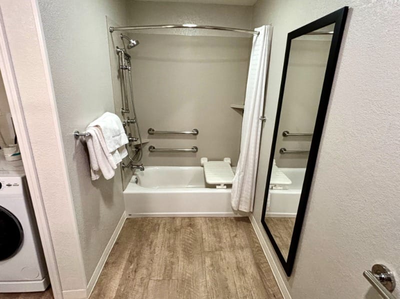 Accessible bedroom and bathroom at WaterWalk Extended Stay by Wyndham Atlanta Perimeter