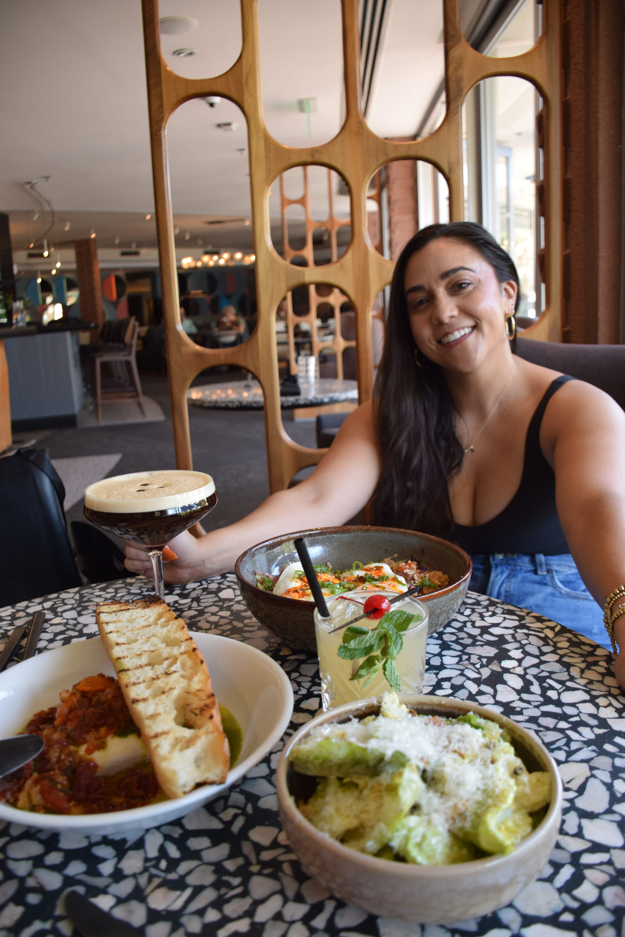 We went to Restaurant Zuzu at Hotel Valley Ho, and the hotel itself was very funky and very accessible. It had ramps inside and automatic doors. They had a lot of different table configurations, and I was actually able to transfer to a little two-top with a large chair, which was fun. I rarely get to do that and it just added a little bit of pizzazz to the meal. The whole place was gorgeous with a cool vibe, and because it's a hotel, everything was very spaced out. I had no issues with accessibility. I was able to get down to the bathrooms through a ramp. I had the breakfast fried rice and an espresso martini, and it was absolutely delicious.