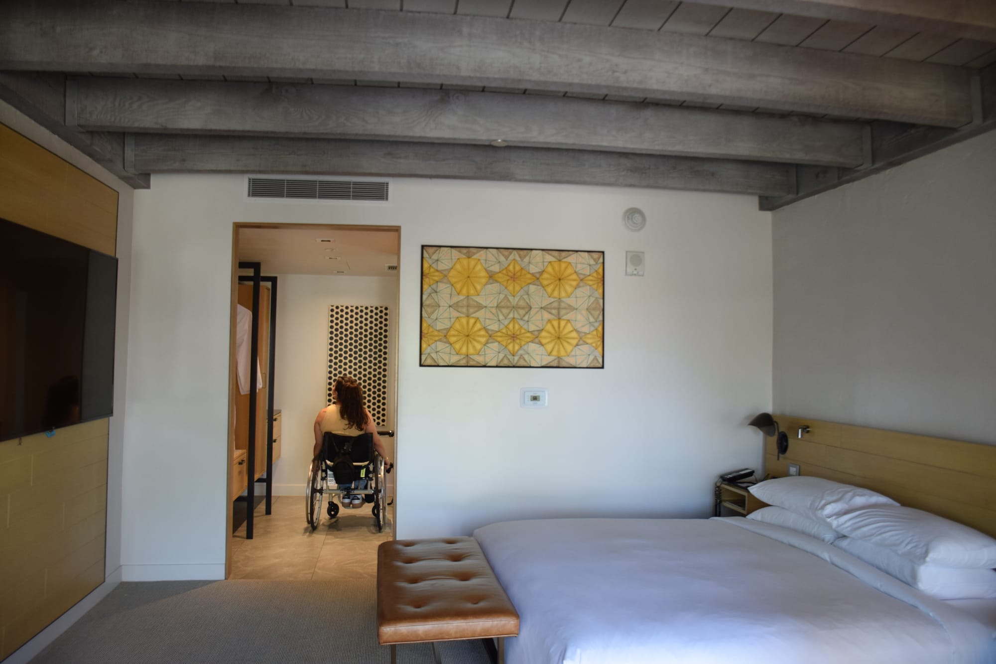 Andaz Resort & Bungalows might have been the most accessible hotel room I've ever stayed in. It was a Bungalow and there was plenty of space throughout. The bed was lowered to a height that made transfers straightforward, and the bathroom – the bathroom was huge. I literally dream about the shower and can never see another shower the same. It had a roll-in setup, a bench, and soap right next to the bench. Plus, they had grab bars. The whole setup felt very safe and luxurious at the same time.