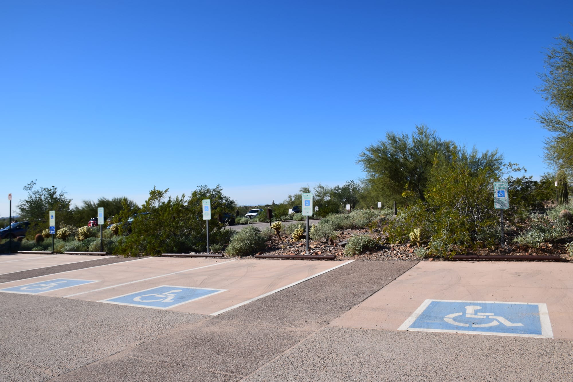 The trailhead has tons of accessible parking, which was fantastic. There are restrooms with accessible stalls too. The staff was helpful and one volunteer even offered us water. One thing to know: because it's gravelly, there's a chance your wheels could get stuck depending on conditions. It's nice to have someone with you depending on your ability level. I think people in power chairs would be able to use it, but an outdoor wheel or freewheel attachment might help.