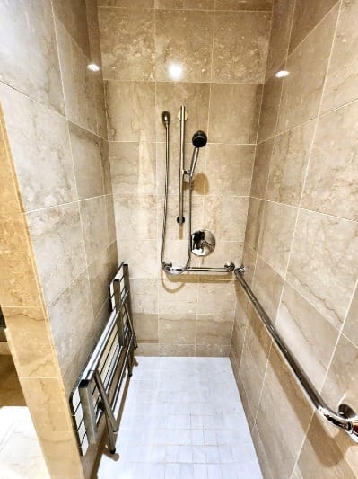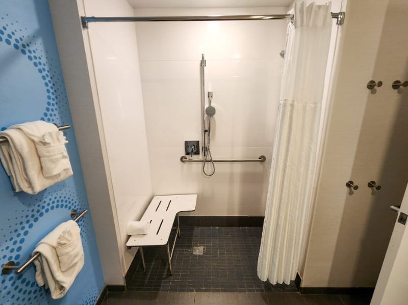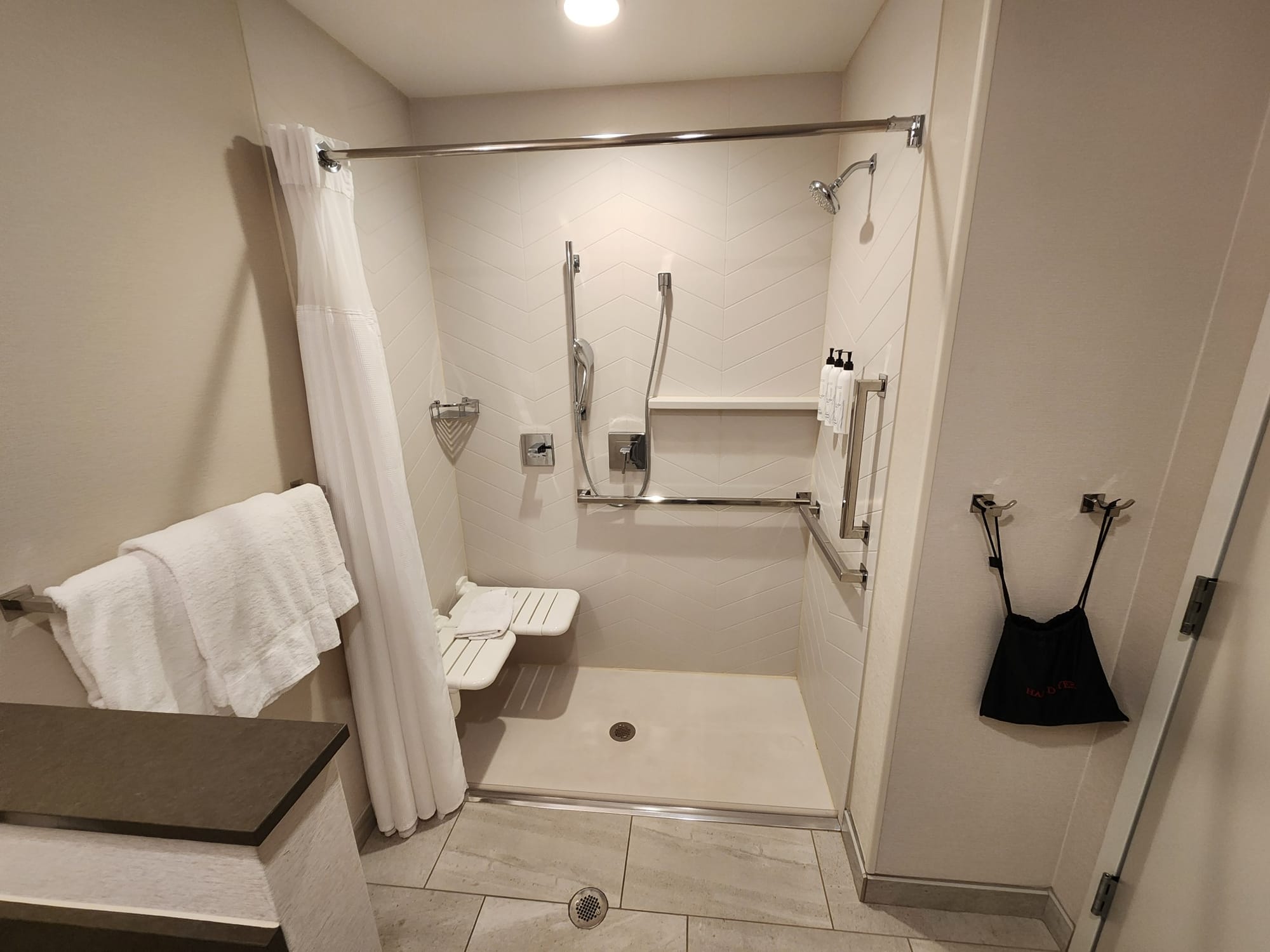 Accessible bedroom, roll-in shower with a seat, and hotel lobby