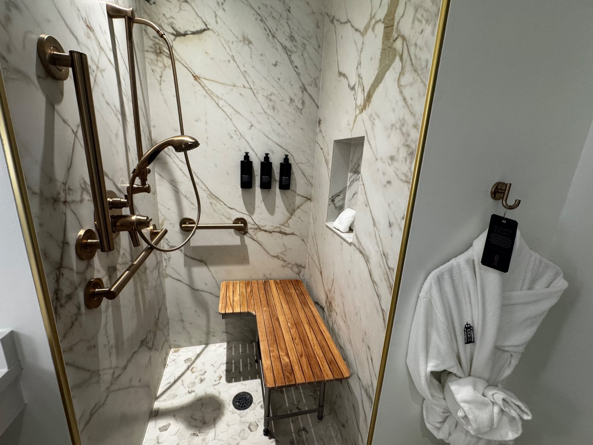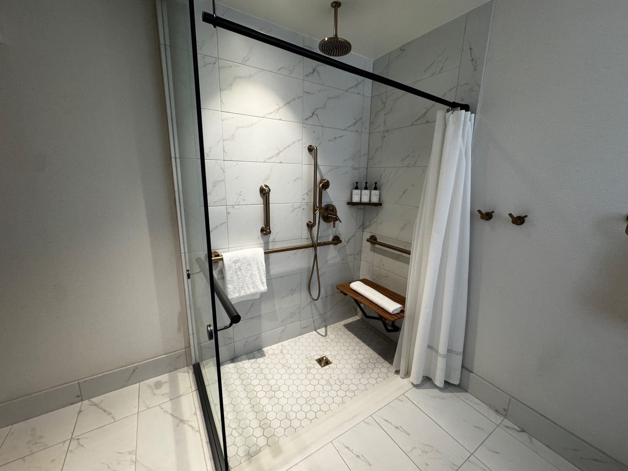 From an accessibility standpoint, it’s a strong option. Accessible rooms include roll-in showers with grab bars and a shower seat, wide doorways, and more than 60 inches of turning space in both the bedroom and bathroom. Common areas throughout the hotel are step-free and onsite there’s a cocktail lounge for evenings and Blue Collar Coffee to get your mornings started right.