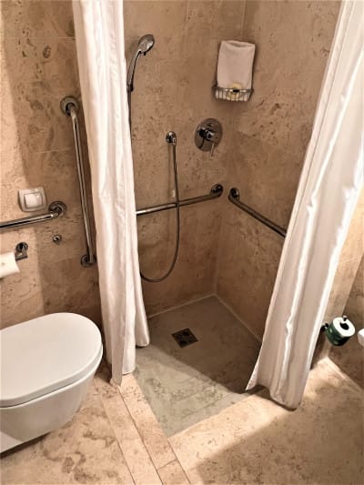 A charming boutique hotel located on the Grand Canal, Hotel Palazzo Giovanelli is a perfect blend of a hospitable staff, comforting amenities, and excellent accessibility. The accessible queen room is spacious and the bathroom has a roll-in shower and toilet grab bars. This particular hotel does not feature a shower seat, so you may have to pack your own if needed.