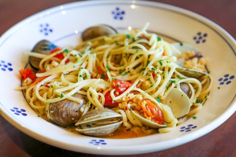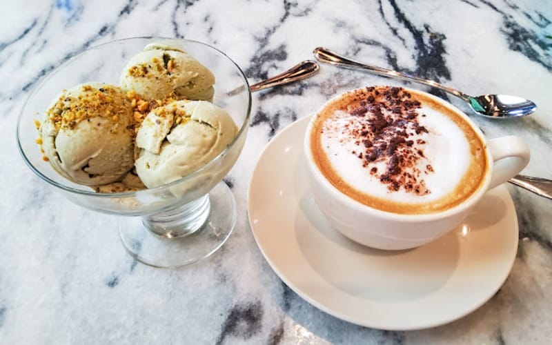Pasta dish, ice cream, and espresso drink at Casa Santos
